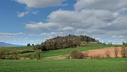 - Nordöstlich des NSG liegt die 100 Meter tiefer liegende Kleine Kuppe, die geologisch den fast gleichen Aufbau wie die Blaue Kuppe hat und auf der sich noch die Ruinenreste der Kirche der um 1500 abgegangenen Wüstung Staufenbühl befinden.[18]