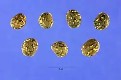 Die dicht behaarte, gerade Hülsenfrucht enthält vier bis sieben Samen. Sie ist 5 bis 7 Zentimeter lang und 1 bis 1,25 Zentimeter breit und gelbbraun.[2] Die Samen sind eiförmig, etwa 6,8 bis 8 Millimeter lang, 5,4 bis 6,8 Millimeter breit und glatt.[2] Sie sind meist hellgrau und braun marmoriert, seltener auch rahmweiß bis gelbrötlich.[2]
