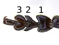 | Abb. 2: Tarsus des Vorder- beins, Glieder 1 – 3 nummeriert |