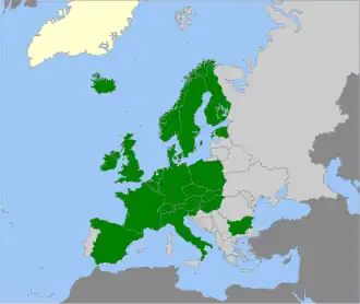 In Deutschland ist der Blaugrüne Reif-Täubling in West-, Nord- und Ostdeutschland flächendeckend verbreitet und oft recht häufig. In Süddeutschland ist er bei weitem seltener und fehlt vielerorts, besonders in den Kalkgebieten.[1][6][9] In Österreich kommt der Täubling selten bis zerstreut vor. Aus den Bundesländern Tirol und Salzburg gibt es keine Nachweise. Auch in Österreich meidet der Täubling die Kalkgebiete und ist am häufigsten am Alpenrand, den Mittelgebirge und dem Hügelland zwischen 300 und 600 m NN. Der Täubling benötigt eine Jahresmitteltemperatur von 7 bis maximal 9 °C.[20] In der Schweiz ist der Täubling recht selten und fehlt vielerorts, am häufigsten ist er noch im Tessin. Auch in der Schweiz bevorzugt der Täubling das Hügelland, der höchste Nachweis stammt aus Campo (Blenio), wo der Pilz auf 1400 m Höhe gefunden wurde.[8][19]