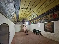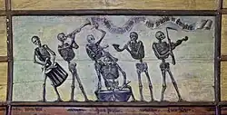 Der Totentanz wurde in Ölfarben rundum an den Wänden und in den Ansätzen des holzverschalten Tonnengewölbes der Kapelle ausgeführt. Über dem eigentlichen Tanz der Paare ist auf der Südseite eine Eingangsmusik dargestellt: „Sechs Sensenmänner spielen mit merkwürdigen, makabren Instrumenten die Weise vom Tod. Der Geiger, dessen Bogen ein Sensenblatt ist, spielt die Melodie, mit Arm- und Oberschenkelknochen schlägt der Trommler (mit dem Gerippe an der Kesselpauke) den Rhythmus und aus der Trompete erklingt nach dem Spruchband die Mahnung: Mein Trompetenschall bringt Freud oder Truebsal in Ewigkeit. Krummhorn und Zinken dienen als Begleitmusik“ (Hermann Trenkle).