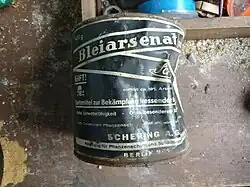 Im ersten Pflanzenschutzmittelverzeichnis der Biologischen Reichsanstalt für Land- und Forstwirtschaft, das 1920 erschien, war auch Arsen aufgeführt. Bleiarsenat wurde zunächst im Obstbau verwendet, wo man es wegen der guten Haftfähigkeit und Pflanzenverträglichkeit, aber auch wegen seiner „Schwebefähigkeit“ (geringe Neigung zum Absetzen) in der Spritzbrühe schätzte. Vor einer Zulassung von Bleiarsenat im Weinbau gab der Reichsausschuß für Weinforschung 1926 mehrere Studien zur Prüfung seiner Eignung in Auftrag. Dabei fielen die hohen Bleirückstände auf (Wein 0,5 – 9 mg Pb/l, Trester 8 – 14 mg, Rappen 106 mg, Weinhefe 207 mg Pb/kg). Der Unterausschuß für Schädlingsbekämpfung des Deutschen Weinbauverbandes sprach sich daher im November 1927 statt für eine Zulassung für ein Anwendungsverbot aus. Das Reichsministerium für Ernährung und Landwirtschaft ordnete bereits im Frühjahr 1928 ein Verwendungsverbot[10] für bleihaltige Verbindungen und deren Zubereitungen im Weinbau an.[11] Im Obstbau scheint Bleiarsenat auch in Deutschland noch bis etwa 1960 verwendet worden zu sein.[5]