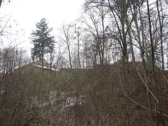 ![]() Der Burghügel, dahinter die neuzeitlichen Ökonomiegebäude in der ehemaligen Vorburg