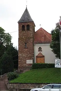 - Evangelische Kirche (Turm 1907, Kirchenschiff 1926/27). An einen bereits 1907 errichteten Turm wurde in den Jahren 1926 bis 1927 das Kirchenschiff im expressionistischen Stil angebaut. Architekt Schäfer aus Zweibrücken verwendete für die Fenstergewände den in der expressionistischen Architektur üblichen spitzwinkligen Giebel, der sich auch, mit Reliefs geschmückt, über dem Eingang findet. Ein um die Fenstergewände sich verkröpfendes Gesimsband verbindet die drei Fenster des Langhauses miteinander. Der Architekt verwendete Haustein nur für die Fenster- und Türgewände sowie die aufgemauerten Eckpfeiler des Langhauses, sonst sind alle Flächen verputzt.