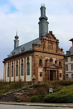 Um 1660 erwarben die Reichsfreiherren von der Leyen, die seit 1456 in Blieskastel Besitzungen hatten, das kurtrierische Amt Blieskastel und erbauten 1661–1676 an der Stelle der alten Burg ein neues Schloss. Unter den Grafen von der Leyen erlebte Blieskastel im 18. Jahrhundert eine neue Blüte, als diese 1773 ihren Wohnsitz von Koblenz nach Blieskastel verlegten und den Flecken Blieskastel zur Residenzstadt ausbauten. Unter der Gräfin Marianne von der Leyen, einer geborenen Freifrau von Dalberg, entstand in Blieskastel ein kulturelles Zentrum. Eine rege Bautätigkeit entfaltete sich. Das Residenzschloss wurde weiter ausgebaut, und auf dem Schlossberg entstand eine Reihe hervorragender Palais und Herrenhäuser für die Hofbeamten der kleinen Residenz, darunter das sogenannte „Schlößchen“, das dem Zweibrücker Baudirektor und Architekten Christian Ludwig Hautt zugeschrieben wird.[7] Daneben wirkten andere Baumeister wie A. G. F. Guillemard, Matthias Weysser, Peter Reheis und der Zimmermeister Franz Schmitt. In dieser Zeit entstanden die ehemalige Franziskanerklosterkirche, das ehemalige Waisenhaus und das Regierungsgebäude.