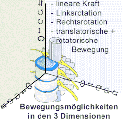 Ein Gelenk ist eine bewegliche Verbindung zwischen zwei oder mehr Knochen. Bewegungen in einem Gelenk finden unabhängig von dessen spezieller Art und Form prinzipiell immer durch Lageveränderung der jeweils gelenkbildenden Knochen relativ zueinander statt. Dabei sind grundsätzlich sechs verschiedene Arten möglich. Dies sind die drei Achsen, um die Rotationen stattfinden können, also Beugung und Streckung sowie Drehung nach links und rechts und Seitwärtsneigung ebenfalls nach links und rechts. Dazu kommen die drei Ebenen, auf denen eine Verschiebung stattfinden kann, also nach vorne und hinten, nach links und rechts sowie nach unten und oben. Ausmaß und Richtung einer Bewegung sind gelenkspezifisch und wurden auch im Bereich der Wirbelsäule vermessen.[5]