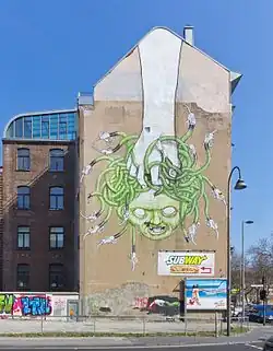Im Sommer 2011 schuf Blu anlässlich des Kölner CityLeaks Festivals das Wandbild Medusa. Es befindet sich in der Neustadt-Nord am denkmalgeschützten Haus Hansaring 33/Ecke Am Kümpchenshof. Vom Giebel erstreckt sich ein Arm nach unten und hält in der Hand das Haupt der zähnefletschenden Medusa. Das Schlangenhaar der Medusa verfremdet Blu in Schläuche, an deren Enden zumeist Zapfpistolen hängen. Die Zapfpistolen tragen die Embleme der bekanntesten Mineralölkonzerne, darunter Shell und BP. Aus einigen offenen Schlauchenden sickern letzte Benzintropfen. Hatte in der griechischen Mythologie der Heros Perseus die Medusa enthauptet, erfolgt hier sinnbildlich die „Enthauptung“ des gegenwärtigen Kraftstoff-Oligopols durch einen modernen Helden.[32][33] Das Wandbild wurde 2013 durch den Neubau eines Hotels (Motel One) auf der davorliegenden Brachfläche vollständig verdeckt beziehungsweise zugemauert.[34]