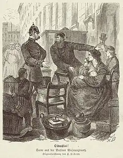 Mieter und ihre Wohnungseinrichtung landeten Ende des 19. Jahrhunderts in Berlin recht häufig auf den Straßen. Hierfür gab es mehrere Gründe. So nahm während der 1870er Jahre die Einwohnerzahl Berlins im Jahr durchschnittlich um 40.000 Menschen zu. Insbesondere aus ländlichen Gebieten in den östlichen Provinzen Preußens zog es Menschen nach Berlin. Die große Mehrzahl hoffte, in einer der dortigen Fabriken Beschäftigung zu finden. Mit dem dynamischen Bevölkerungswachstum konnte die Infrastruktur jedoch nicht mithalten. Auch die sich in der Gründerzeit verschärfende Wohnungsspekulation führte dazu, dass die Mieten drastisch stiegen und gleichzeitig neue Wohnungen in nicht ausreichender Zahl gebaut wurden.[3] Der Historiker David Clay Large schätzt, dass sich die Mietpreise in Berlin verglichen mit der Situation 1869 in den Gründerjahren im Schnitt verdreifachten.[4]