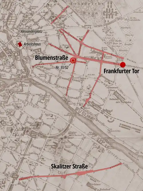 Die Polizei zog lediglich repressive Lehren aus dem zurückliegenden Krawall. Kaum einen Monat nach den Blumenstraßenkrawallen, im August[67] 1872, wurde das Barackenviertel vor dem Landsberger Tor zwangsgeräumt, die Bewohner sollten im Arbeitshaus am Alexanderplatz unterkommen.[68] Bei der Räumung rückte sie in der Nacht an und umzingelte die Anwohner. Auf diese Weise hatten die Bewohner keine Chance, Widerstand zu organisieren.[69]