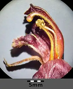 Der einfache Stängel ist bräunlich, gelblich oder rötlich und hat meist weniger als 15 Schuppenblätter. Die Blüten, mit gewürznelkenähnlichem Duft, stehen in dichten Trauben. Die Krone ist innen glänzend trüb-blutrot und außen gelb, gegen den Saum zu rot(braun). Die gelbe Narbe hat einen purpurbraunen Rand. Die Staubfäden sind oben drüsig. Der Griffel ist drüsig behaart.
