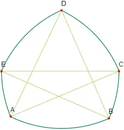 Es entsteht das Bogenfünfeck ABCDE mit den Kreisbögen AB, BC, CD, DE und EA.