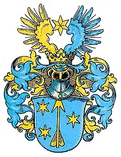 Blasonierung: In Blau ein senkrecht stehender goldener Pfeil aufwärts gerichtet, begleitet rechts von zwei goldenen Sternen übereinander, links von einem Stern. Auf dem gekrönten Helm ein offener Flug, der rechte Flügel gold, der linke blau, dazwischen ein goldener Stern. Die Helmdecken sind blau–gold.[4]