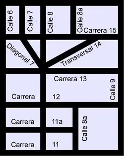 Zahlreiche Straßen, darunter die Panamericana, verbinden die Stadt mit anderen Großstädten. Bogotá ist schachbrettartig aufgeteilt. Die Straßen sind nach „carreras“ und „calles“ nummeriert, wobei einige der großen Umgehungs- und Hauptverkehrsstraßen auch einen Namen tragen (wie beispielsweise Carrera 14 – Avenida Caracas).