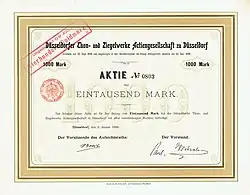 - ↑ „Düsseldorfer Thon- und Ziegelwerke AG“ Abbildung einer Aktie über 1000 Mark vom 2. Januar 1900 und Geschichte (Quelle: Peus Nachf.), auf scriposale.de (Marktplatz für historische Wertpapiere), abgerufen am 14. Oktober 2022