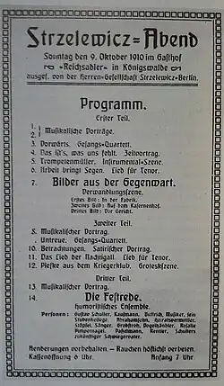 1892 zog Strzelewicz nach Berlin. Dort gründete er auf Anraten der Partei wenig später eines der ersten Agitprop-Theater, die „Gesellschaft Vorwärts“, ein politisch-satirisches Berufstheater aus drei bis vier Leuten, das als Wanderbühne durch ganz Deutschland zog.