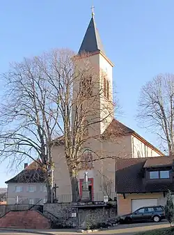 - Die Pfarrkirche St. Hilarius wurde 1840 von Hans Voß im Weinbrenner-Stil errichtet.