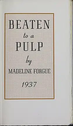 | 18. | Madeline Forgue | “Beaten to a Pulp.” | Entworfen von Madeline Forgue, Schriftarten Linotype Granjon, Ludlow Eden Light und Cornet, gedruckt auf Worthy Hand and Arrows Papier von Black Cat Press. |