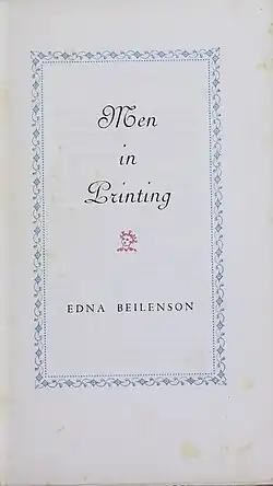 "The Distaff Side is a loosely-knit organization ... of women; and its membership has been enlisted from printing-offices, publishing houses, studios and other hiding-places where may be found devotees of the graphic arts.... [It] was born out of a righteous indignation that sufficient recognition had never been accorded to woman's place in the history of printing. To amend this deficiency, The Distaff Side published its first book, titled Bookmaking on the Distaff Side, which disclosed the monumental contributions which spinsters, wives, and widows have made to the graphic arts." – Edna Beilensen[5]