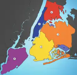 - Die Boroughs wiederum gliedern sich in insgesamt 59 offizielle Community Districts (CD), deren Rolle im Kapitel 69 der Charter der City of New York festgelegt sind.
