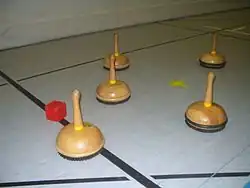 Das Spielfeld umfasst eine 12 m (bei Frauen 10 m) lange Wurfbahn sowie ein sich daran anschließendes 4 m langes Zielfeld. Es spielen jeweils zwei Mannschaften mit drei Spielern gegeneinander, zu jeder Mannschaft gehört ein zusätzlicher Mannschaftsführer. Sogenannte Mixed-Mannschaften (zwei Frauen und zwei Männer, wobei pro Spiel jeweils nur drei aktiv sind) sind gestattet und werden in Wettbewerben in die Gruppe der Herrenmannschaften eingegliedert. Jeder Spieler einer Mannschaft hat pro Durchgang einen Wurf.