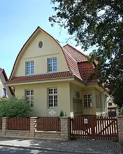 Das Gebäude entstand in den Jahren 1911/12 als kleines Siedlungshaus. Die Fassadengestaltung weist Elemente des Jugendstils und des Neoklassizismus auf.