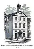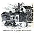 Das erste Schulgebäude auf der Südseite der School Street, 1748–1810. | ||