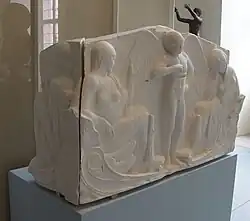 Das Verhältnis zwischen dem jungen, kräftigen Leierspieler und der alten, gekrümmten Frauenfigur ist laut Simon genauso antithetisch wie das zwischen der flötespielenden Hetäre und der Braut auf den beiden Seitenreliefs des Ludovisischen Thrones. Diese wiederum zeigten in einer antistrophischen Aussage über „Wesen und Art weiblicher Hingabe“[8] eine Verbindung zum Aphroditemotiv des Hauptreliefs. Daraus schließt Simon: „In ähnlicher Weise müßte auch das Thema der beiden Bostoner Seitenflügel, das den Glanz der Jugend und das Dunkel des Greisenalters umspannt, im Mittelfeld des Triptychons auf göttlicher Ebene verwandelt wiederkehren.“[8]
