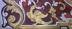 - 1684 Truhe cabinet de marqueterie en forme de tombeau in Boullemarketerie (countre-partie) nach Motiven von Jean Louis Berain, angefertigt für Ludwig von Frankreich, Le Grand Dauphin (* 1661; † 1711), jetzt in den State Apartments in Blenheim Palace sowie (première-partie) und (countre-partie) im Getty Museum in Los Angeles (Abb. siehe unter Sammlungen, Link Getty Center).
