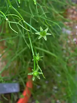 Bowiea volubilis, Habitus und Blüten, rechts ist die grüne Knolle. | ||||||||||||