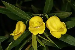 Es sind deutliche Blütenstiele vorhanden. Die zwittrigen Blüten sind zygomorph und fünfzählig mit doppelter Blütenhülle. Die fünf Kelchblätter sind glockenförmig verwachsen und der Kelch endet mit fünf nahezu gleich großen Kelchzipfeln, der achszugewandte Kelchzipfel ist am breitesten. Die fünf Kronblätter sind zu einer Kronröhre verwachsen, die an ihrer Basis kurz zylindrisch und darüber breit glockenförmig ist. Die weiße oder gelbe Krone besitzt einen zweilippigen Kronsaum. Die vier Staubblätter stehen nicht über die Krone hinaus, gelegentlich sind Staubblätter zu Staminodien verkümmert. Der oberständige, zwei- oder dreikammerige Fruchtknoten ist zylindrisch oder konisch. Die Narbe ist keulenförmig.
