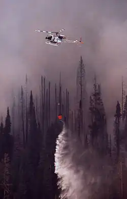 Etwa 120 Hubschrauber und Starrflügelflugzeuge wurden zur Bekämpfung des Feuers eingesetzt. Die Flugzeuge absolvierten mehr als 18.000 Flugstunden und warfen 1,4 Millionen US-Gallonen (5,3 ML) Löschschaum und 10 Millionen US-Gallonen (38 ML) Wasser ab.[52] Mehr als 100 Feuerwehrautos wurden dem Feuer zugeteilt.[52] In den Gebäudekomplexen wurden einige der dauerhaft stationierten Löschfahrzeuge eingesetzt. Im gesamten Park wurden kleinere, für die Fortbewegung in unwegsamem Gelände geeignete Waldbrandlöschfahrzeuge verwendet.