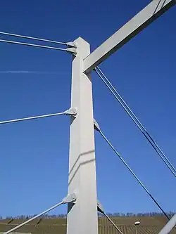 Die Seile sind in einem Abstand von lediglich einem Meter links und rechts der Fahrbahn in den Längsträgern der Brücke verankert und werden deshalb von abgeschrägten Sockeln aus Stahlbeton vor dem Anprall von Fahrzeugen geschützt. Die Fuß- und Radwege werden in kanzelartigen Verbreiterungen um die Pylonstiele herumgeführt.