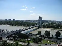Die Brücke des Slowakischen Nationalaufstandes in Bratislava (slowakisch offiziell Most SNP,[1] kurz für Most Slovenského národného povstania, ab 1993 bis 29. August 2012 offiziell Nový most – Neue Brücke; in August 2012 wurde sie wieder in Most SNP zurück umbenannt[3]) ist eine zwischen 1967 und 1972 nach einem Entwurf von Arpád Tesár (Bauingenieur), Jan Lacko (Architekt) und Ivan Slameň (Architekt) errichtete Straßenbrücke über die Donau, die den Namen nach dem Slowakischen Nationalaufstand 1944 trägt. Sie ist die bekannteste der sechs Donaubrücken in der Stadt und verbindet den Stadtteil Petržalka mit der Altstadt (Staré Mesto) von Bratislava.