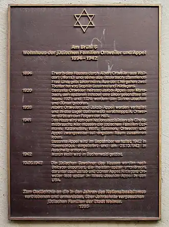 Dieses Gebäude gehörte seit 1894 der jüdischen Familie Ortweiler/Appel. Dieses Gebäude wurde als sog. Ghettohaus ebenso missbraucht wie das Haus Belvederer Allee und Haus Plan 4 in Oberweimar.[1] Es wurde zu diesem Zweck 1941 umfunktioniert. In diesem Jahr erfolgte auch die Deportation der Bewohner und der Zwangsbewohner. Es waren auf engsten Raum acht Familien untergebracht. Niemand der hier untergebrachten Familien überlebte den Holocaust. Eine Gedenktafel wurde 1998 angebracht, die dem Charakter der Stolpersteine hat.[2][3] Genannt wurden die Familien, die unfreiwillig hier untergebracht waren. Neben den eigentlichen Bewohnern, die Familien Ortweiler und Appel, waren es die Familien Katenstein, Wolff, Gutmann und Salomon. Es sind auch Stolpersteine in den Gehweg eingelassen. Diese sind auf der Liste der Stolpersteine in Weimar vermerkt.