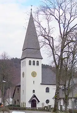 - Die evangelische Kirche ist ein 1912 errichteter und geweihter Jugendstilbau mit ortsbildprägendem Turm einschließlich gestuftem Pyramidenhelm.[8]