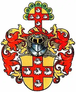 Blasonierung: In Gold ein rotes mit fünf (1:3:1) silbernen Muscheln belegtes Kreuz. Auf dem rot-golden bewulsteten Helm das Kreuz des Schildes, darüber ein Bogen von natürlichen Pfauenfedern. Die oberen Winkel vom Kreuz bis zum Bogen sind golden. Die Helmdecken sind rot-golden.[2]