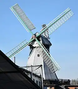 Gegenüber dem Flügelkreuz ist eine Windrose montiert, mit der die Mühlenkappe automatisch in den Wind gedreht wird. Das dafür genutzte achtflügelige Windrad hat einen Durchmesser von 3,5 m und dreht sich nur, wenn der Wind nicht genau von vorn auf die Hauptflügel trifft. Kommt der Wind von der Seite, setzt eine Drehung ein und über ein Getriebe mit einer Übersetzung von 1 zu 2633 wird die Kappe in Richtung Wind ausgerichtet. Der Mühlenkörper ist seit 1935 mit Tafeln aus verzinktem Blech bedeckt. Sie ersetzten aus Feuerschutzgründen die ursprüngliche Reetabdeckung.[3] Die Mühlenkappe hat seit 1993 eine Abdeckung mit Zinkblech. Die Mühle wird durchzogen von einer 10,65 m langen Königswelle aus Lärchenholz. Die Drehbewegung der Flügel wird über eine Flügelwelle auf ein Kammrad übertragen, das diese Drehbewegung auf ein am höchsten Punkt der Königswelle sitzendes Korbrad (Bunkler) weitergibt. Auf der Königswelle sitzt unten, auf Höhe des Absackbodens, ein Stirnrad mit einem Durchmesser von 2,45 Metern, das auf einen eisernen Treibling wirkt, über den der Mühlstein angetrieben wird.[2]