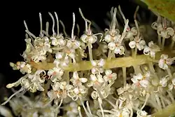 Die relativ kleinen, süß duftenden, meist zwittrigen Blüten sind kahl, etwa 5 Millimeter lang, radiärsymmetrisch und vierzählig.[1][6][7] Es ist nur ein Kreis mit vier freien, weißen, schmal verkehrt-eiförmigen und zurückgerollten Blütenhüllblättern vorhanden.[8] Die Blütenblätter sind etwas länger als die Staubblätter. Es ist nur ein Kreis mit vier Staubblättern vorhanden.[1][6] Die linealischen Staubfäden sind frei. Die ovalen Staubbeutel besitzen ein dunkles, gerundetes Anhängsel (Drüse). Es ist ein ringförmiger Diskus vorhanden. Der flaumig behaarte, oberständige Fruchtknoten enthält zwei hängende Samenanlagen. Der dickliche Griffel ist gerade.[6]