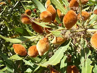 Behaarte Früchte und ledrige Blätter von Brabejum stellatifolium | ||||||||||||