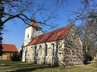 - Die Dorfkirche ist eine spätgotische Saalkirche, die überwiegend aus Raseneisensteinen errichtet wurde. In ihrem Innern steht unter anderem ein Kanzelaltar aus der ersten Hälfte des 18. Jahrhunderts. Die erste Orgel wurde 1796 von dem Treuenbrietzener Orgelbauer Johann Tobias Turley (1773–1829) gebaut. 1845 erhielt die Kirche eine neue Orgel von Gottfried Wilhelm Baer, wobei der ursprüngliche Prospekt erhalten wurde.[7]