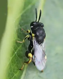 Die Erzwespen sind etwa 5 mm lang.[2] Sie sind überwiegend schwarz gefärbt. Die Tegulae sind gelb. Die Beine sind schwarz-gelb gemustert. Die Femora sind mit Ausnahme des apikalen Endes schwarz gefärbt. Die Tibien sind auf der Innenseite schwarz gefärbt, ansonsten sind sie gelb. Insbesondere die hinteren Tibien sind auf der Dorsalseite auf der gesamten Länge gelb gefärbt.[2] Die Tarsen sind gelb. Die hinteren Femora sind verdickt.