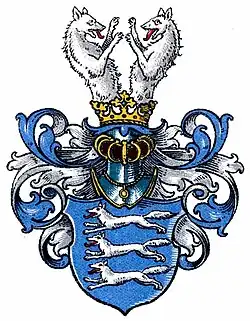 Blasonierung: In Blau drei silberne, nach rechts laufende Wölfe übereinander. Auf dem gekrönten Helm ein zwei wachsende, silberne, gegeneinander gekehrte Wölfe. Die Helmdecken sind blau-silber.[6]