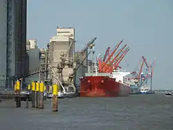 Im Binnenhafen, der über eine Seeschleuse zu erreichen ist, werden Küstenmotorschiffe und Binnenschiffe für den Logistikverkehr abgewickelt. Im Seehafen Brake werden Forstprodukte, Eisen, Stahl, Anlagen, Futtermittel und Getreide umgeschlagen.[20] Im Jahr 2021 wurden hier 5,136 Millionen Tonnen Güter umgeschlagen.[21]