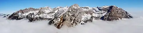 Hauptgruppe des Rofan von Südwesten (Ebner Joch) gesehen. Von links nach rechts: Dalfazer Wände; Streichkopf, Hochiss, Spieljoch, Seekarlspitze, Haidachstellwand, Rofanspitze, Sagzahn, Vorderes Sonnwendjoch