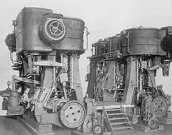 Die Einheiten der Brandenburg-Klasse wurden von Dampfmaschinen angetrieben. Die nötige Kesselanlage bestand aus zwölf querstehenden Zylinderkesseln, die auf vier Kesselräume aufgeteilt waren. Mit zusammen 36 Feuerungen und einer je nach Hersteller leicht unterschiedlichen Gesamtheizfläche von 2.291 bis 2.358 m² erzeugten sie den nötigen Dampfdruck von 12 atü.[15] Dabei war jeder der 2,92 m langen und 1,99 m im Radius messenden Kessel in der Lage, maximal 6 t Dampf pro Stunde umzusetzen, wofür bis zu 750 kg Kohle notwendig waren.[60]