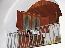 Die Kabinettorgel hat 5 Register ohne Pedal, die Windzufuhr erfolgt über einen Fußhebel.