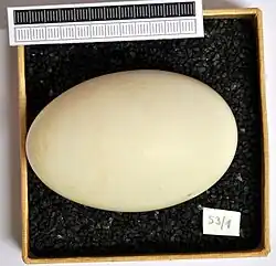 Die Eiablage beginnt in der Regel neun Wochen nach Wiederbesetzung des Nistplatzes. Das Gelege eines Weibchens umfasst gewöhnlich zwischen sieben und zwölf Eier. Diese sind glattschalig, stumpfoval und rahmweiß.[6][35] Die Eier wiegen zwischen 75 und 77 Gramm. Geht das Gelege verloren oder wird das Weibchen während der Bebrütung so gestört, dass es das Gelege aufgibt, erfolgt in der Regel kein Nachgelege.[36][37]