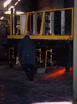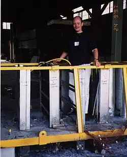 Der fertige Prüfkörper wird mittels Kran zum Ofen transportiert und dort auf eine Keramikfaserdichtung gesetzt. Hier sieht man die Unterseite. Die kanadische Prüfungsnorm ULC S-115 schreibt vor, dass die Durchbrüche 12″ (30 cm) in den Ofen reichen müssen, um dort Hitze aufzunehmen, die beim Durchleiten das Schott auch von innen belasten. In Deutschland schreibt die DIN 4102 eine Länge von 1 m vor, welches realistischer ist. Nordamerikanische Wandöfen sind dazu nicht tief genug.