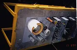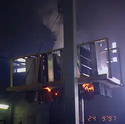 Ofen zum Gebrauch für Brandprüfungen. Ein einfacher Metallkasten, mit Keramikfaser isoliert und durch Rohre geschützte Thermoelementen versehen. Unten sieht man die perforierten Gasrohre, wodurch der Brennstoff in die Brennkammer kommt. -