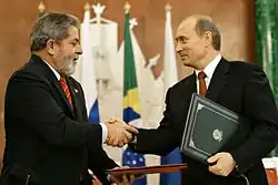 Am 18. Oktober 2005 unterzeichneten die beiden Staatsoberhäupter während eines Staatsbesuchs von Präsident Lula in Moskau die bilaterale Strategische Allianz Brasilien-Russland sowie ein Abkommen, das es der brasilianischen Raumfahrtagentur ermöglichte, den ersten brasilianischen Astronauten, Marcos Pontes, an Bord der Sojus TMA-8 ins All zu schicken. Beide Länder haben sich in der folgenden Zeit wiederholt gegen eine zu starke Hegemonie der Vereinigten Staaten in internationalen Organisationen ausgebrochen und beide sahen z. B. den Irakkrieg der USA kritisch. Um eine stärkere Mitbestimmung der Schwellenländer zu sichern, kooperieren beide Länder im Rahmen der BRICS-Staaten. Das erste Gipfeltreffen der vier Gründerstaaten Brasilien, Russland, China und Indien fand am 16. Juni 2009 in Jekaterinburg statt. Das zweite Treffen erfolgte am 15. April 2010 in Brasília. Weitere Treffen fanden danach jährlich statt.